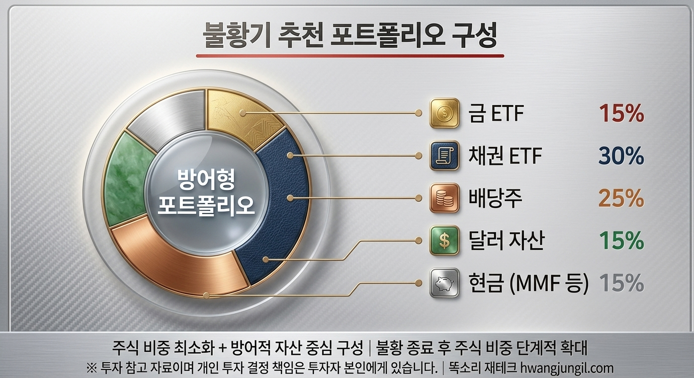 불황기에 금리는 인하 방향으로 돌아서는 경우가 많습니다. 금리가 하락하면 채권 가격은 상승합니다. 따라서 불황 진입 초기에 채권 ETF 투자를 늘리는 것은 가격 상승과 이자 수익을 동시에 기대할 수 있는 전략입니다. 삼일PwC 경영연구원은 2026년 미국 기준금리가 연말 3.26%까지 인하될 것으로 전망했습니다. 이는 장기채 ETF 보유자에게 유리한 환경을 만들어 줍니다. 포트폴리오의 20~30%를 단기·중기 채권 ETF에 배분하는 것을 권장합니다.